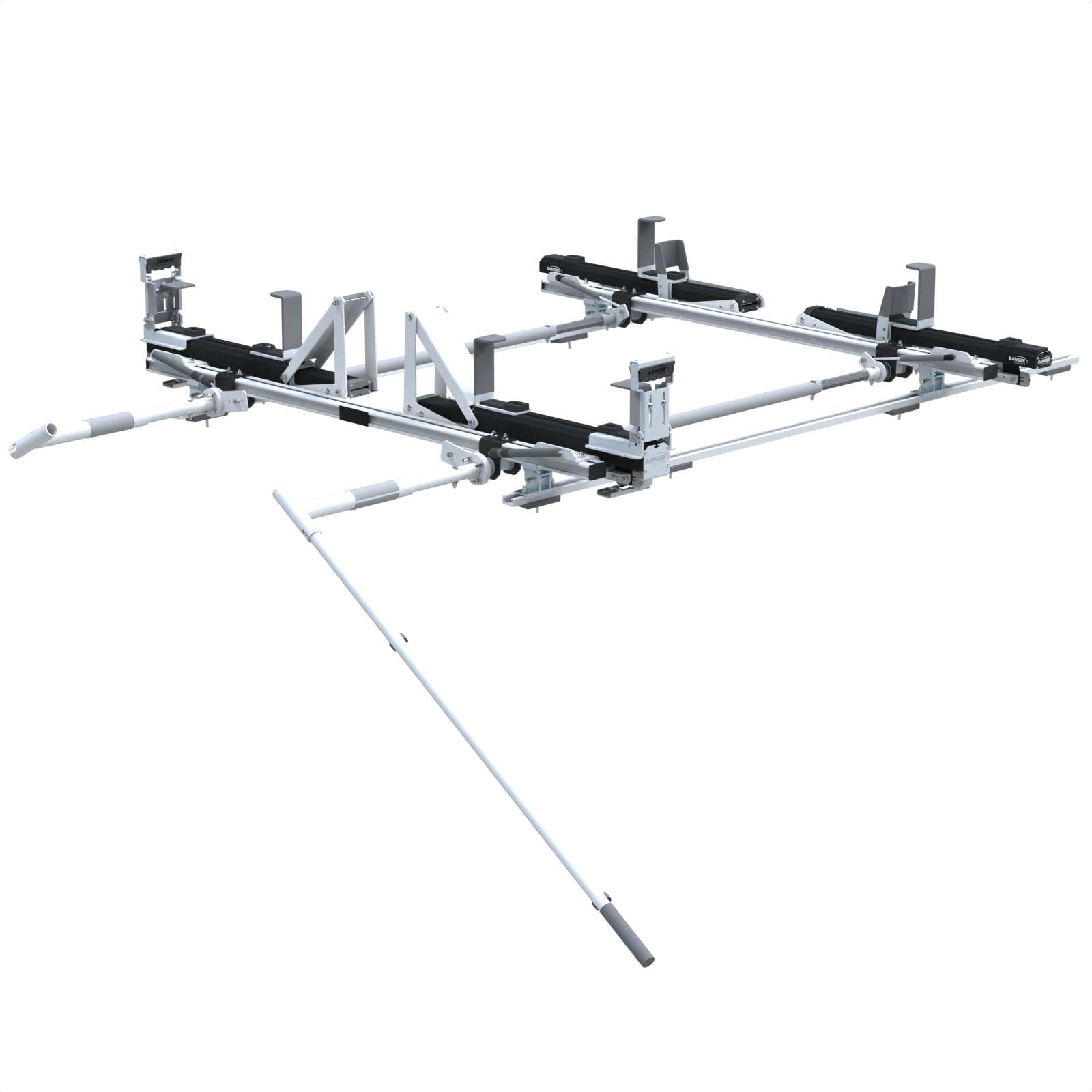Double side Max Rack 2.0, aluminum, Ford Transit drop down ladder rack, Med/High Roof, Long/Extended 148″ WB. Model: 1880-FTL